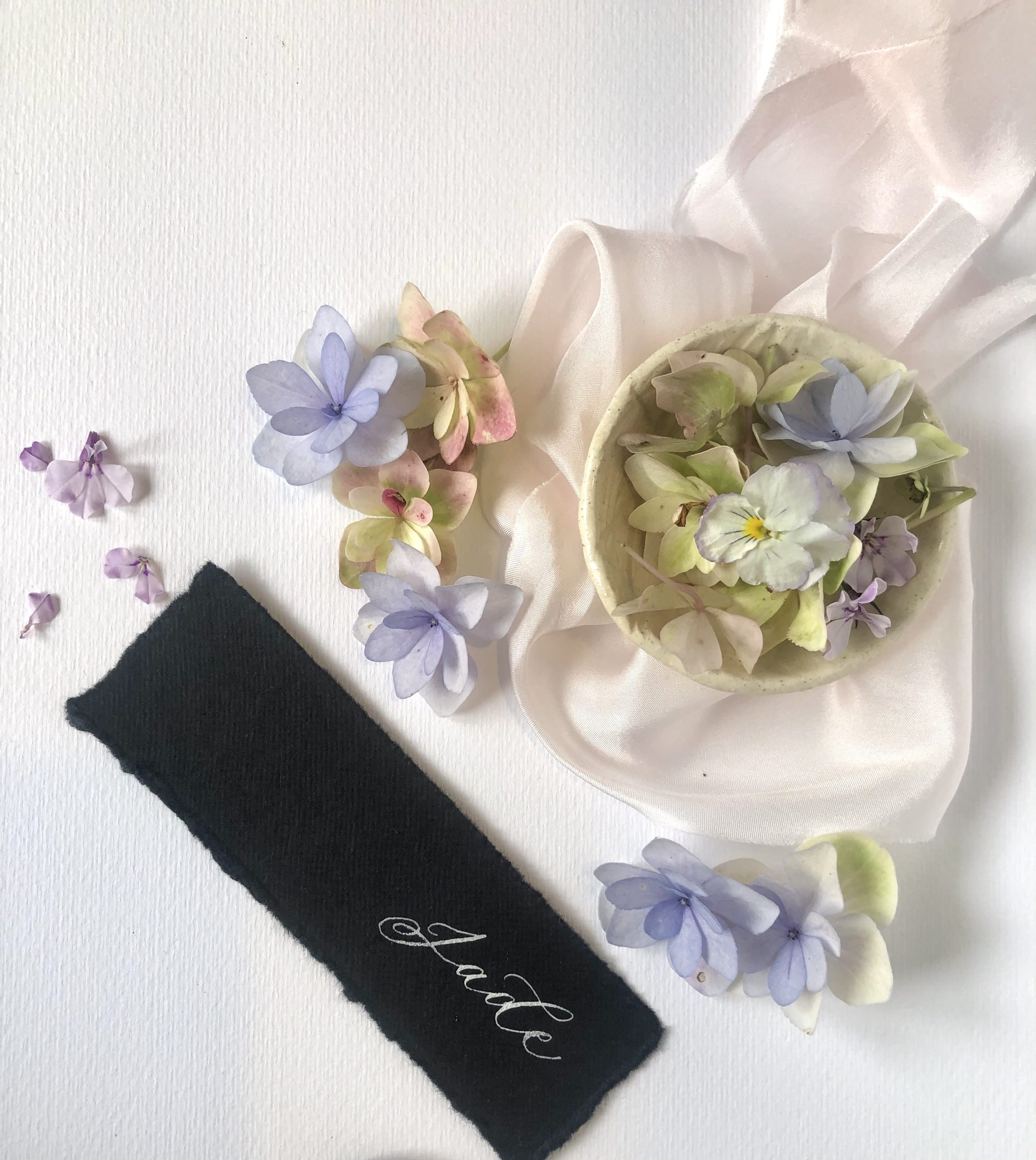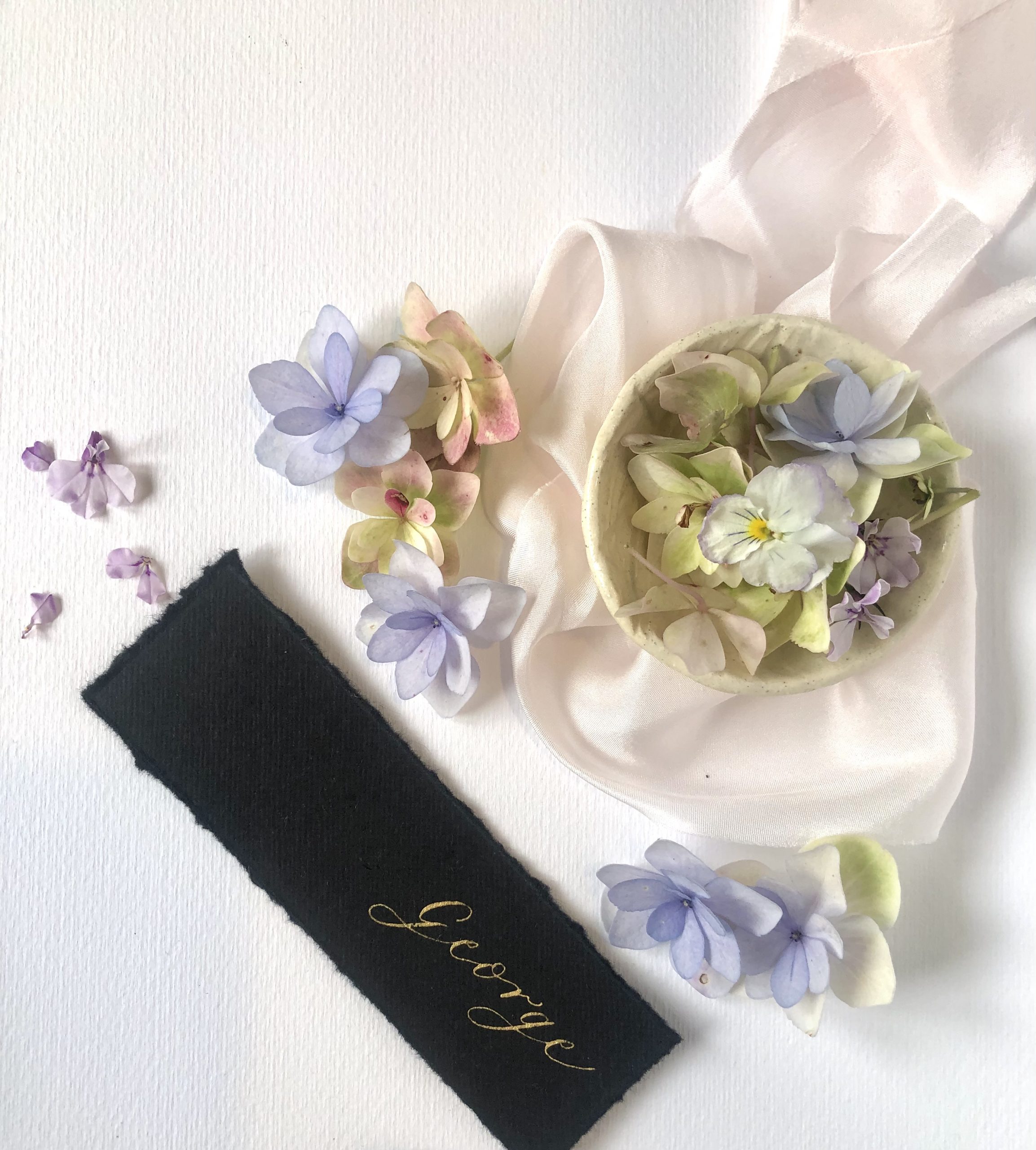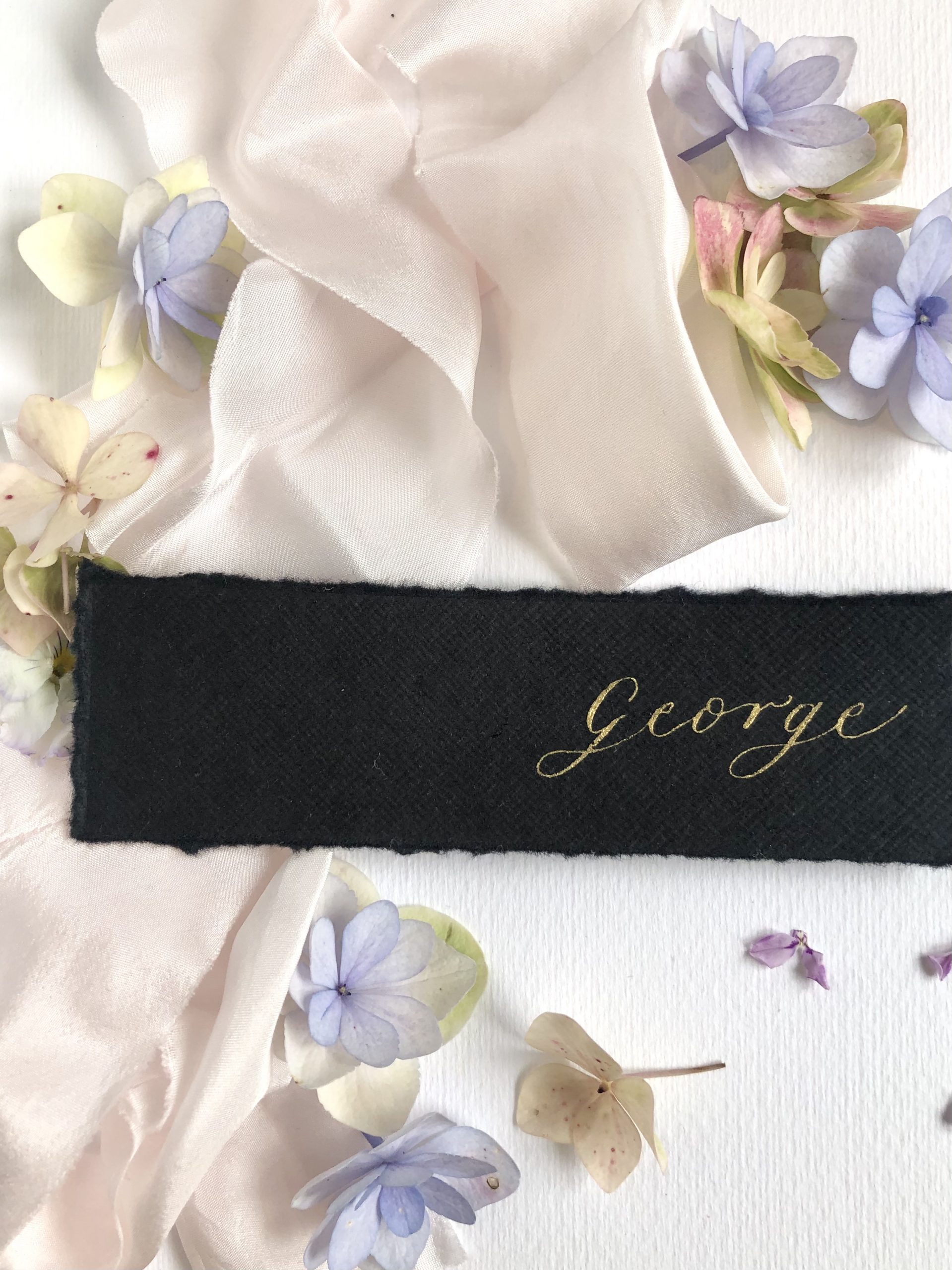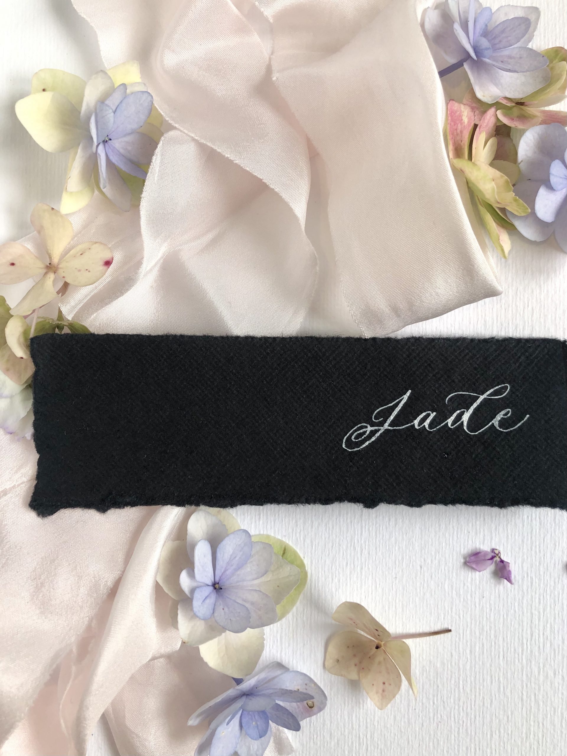 These beautiful wedding place cards are hand written in gold, black or white ink on a quality, hand made paper. The edges are hand torn for a soft, organic look. The calligraphy is a romantic, modern font. Perfect for weddings or any fun event, these personalised place cards are not only practical but also add a gorgeous detail to your table. This handmade paper is recycled cotton so is an eco-friendly choice if you are having an eco-friendly wedding.