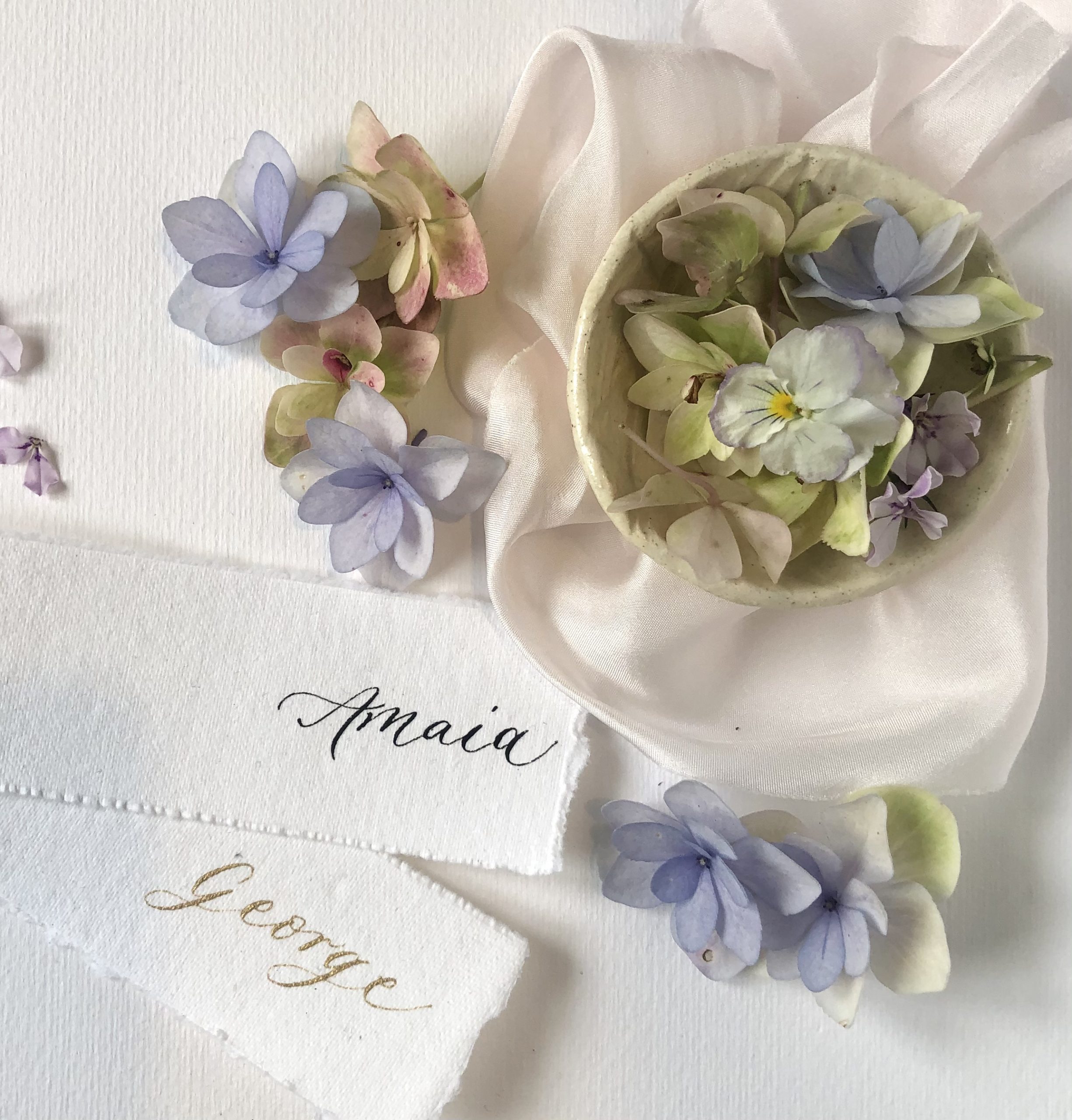 These beautiful wedding place cards are hand written in gold, black or white ink on a quality, hand made paper. The edges are hand torn for a soft, organic look. The calligraphy is a romantic, modern font. Perfect for weddings or any fun event, these personalised place cards are not only practical but also add a gorgeous detail to your table. This handmade paper is recycled cotton so is an eco-friendly choice if you are having an eco-friendly wedding.